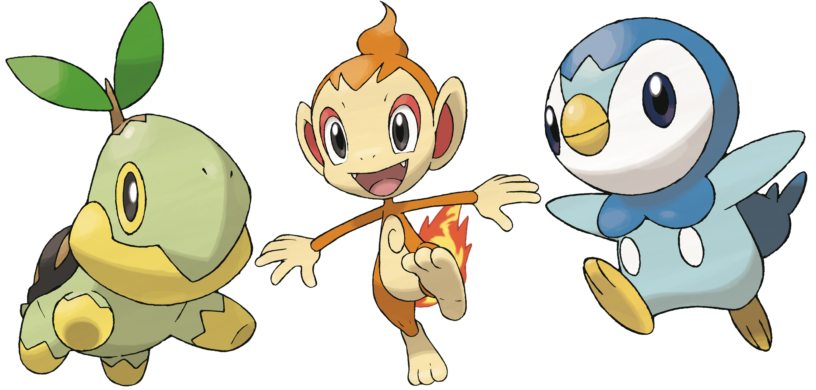 los tres Pokémon iniciales de la región de Sinnoh: Turtwig la opción de tipo planta, Chimchar es la opción de fuego y Piplup